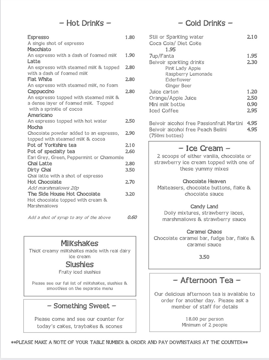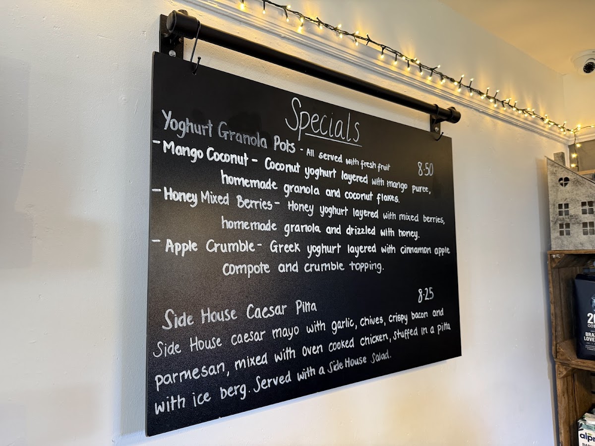 Hot drinks such as Espresso, Macchiato, Latte, and Mocha round out the menu, along with options for a comforting Hot Chocolate. Whether you're in the mood for a light bite, a hearty meal, or a delicious drink, The Side House offers an impressive selection to suit all tastes.
