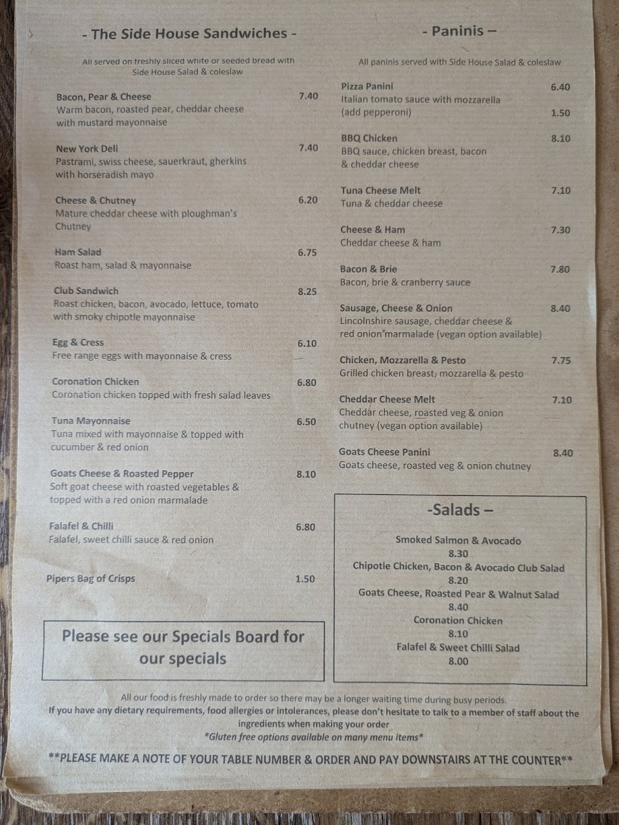 The Side House, located at 94 Main St, Claypole, Newark NG23 5BA, offers a diverse and tempting menu that caters to a wide range of tastes and preferences. The sandwich selection includes classic options like the Bacon, Pear & Cheese and New York Deli, as well as the savory Cheese & Chutney and Ham Salad. For something more filling, the Club Sandwich is also available. Those who enjoy a toasted panini can choose from mouthwatering varieties such as the Pizza Panini, BBQ Chicken, Tuna Cheese Melt, and comforting choices like Cheese & Ham, or the rich Bacon & Brie.
