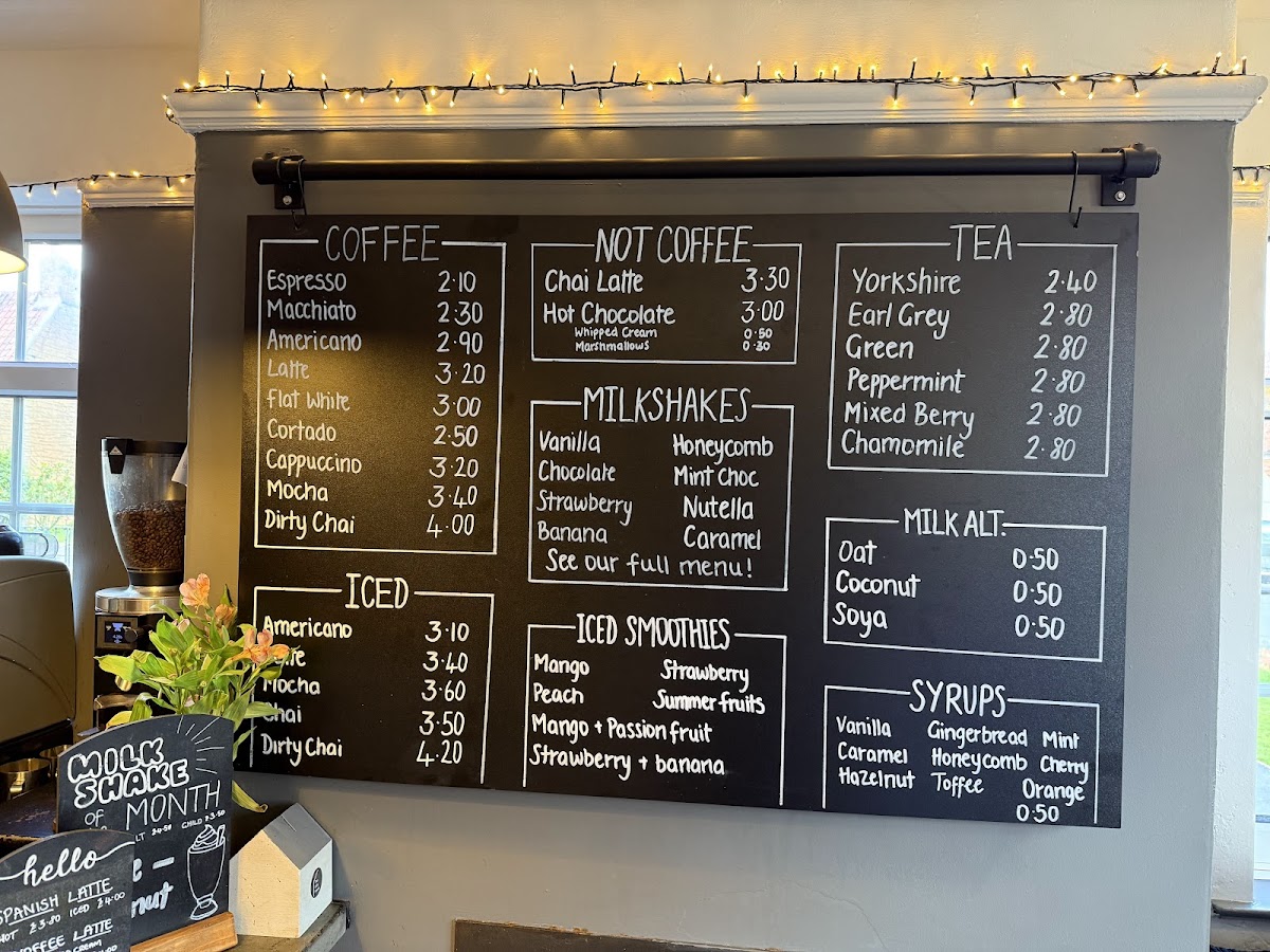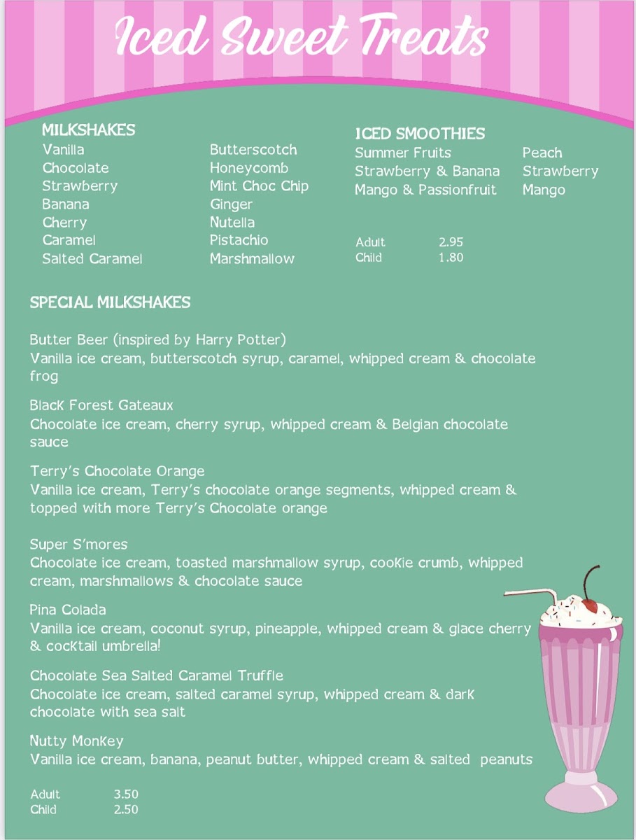 The Milkshakes menu offers classic flavors like Vanilla, Honeycomb, Chocolate Mint Choc, and Strawberry, while the Special Milkshakes bring a unique twist with indulgent choices like Butter Beer, Black Forest Gateaux, and Terry's Chocolate Orange. If you’re after something exotic, the Pina Colada and Super S'mores shakes offer a sweet escape.